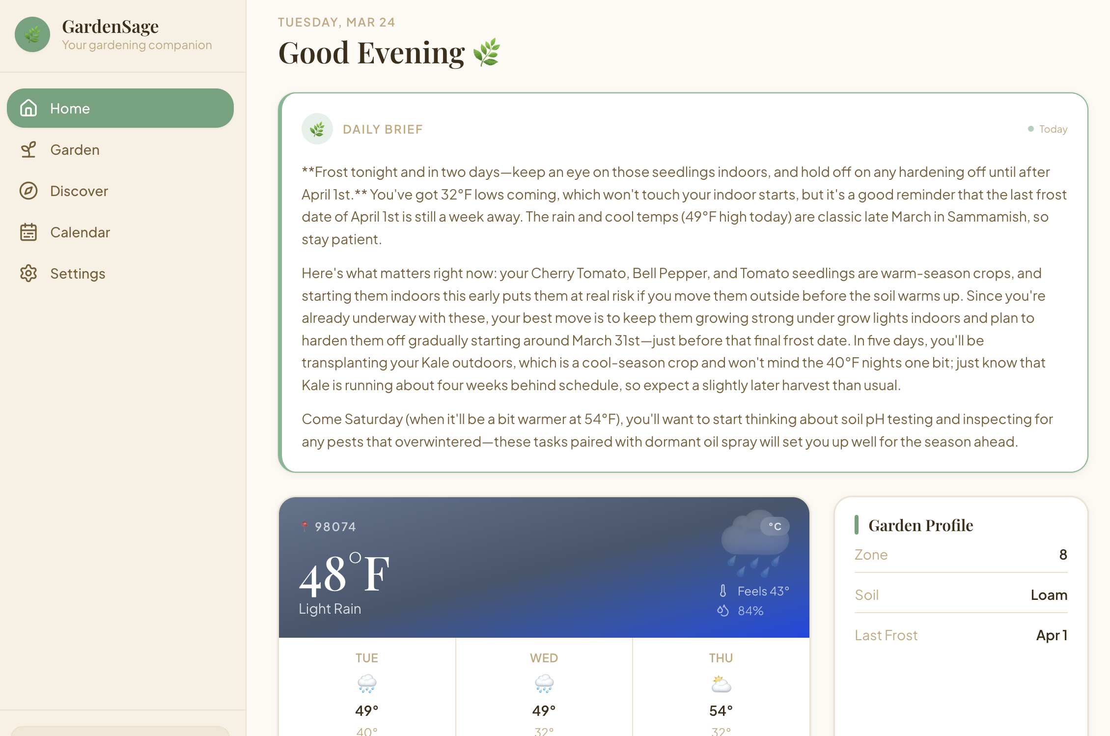 She wants the app to consider her garden location and sun exposure. Give her a daily or weekly task list based on current plants and conditions. Retain basic facts about her location and always-need-to-do tasks. Do not refuse plants. Instead, give her ways to enable growth. Suggest companion planting. Allow her to define planting themes. Look at upcoming weather and give alerts. Cover your pansies. Frost is coming. Show what to expect each day as plants grow.
